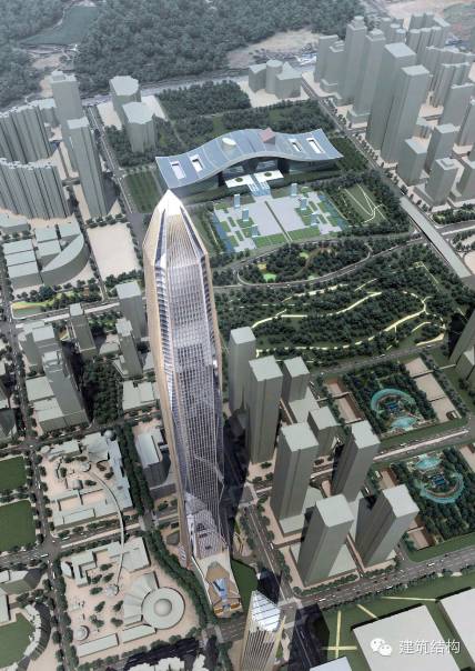 平安金融中心简介:项目位于深圳市福田中心区,总用地面积18931.74 m2,总建筑面积460665.0m2,建筑基底面积12305.63m2。整体结构采用在带状桁架间设置单斜撑的方案,塔楼结构采用巨型钢斜撑外框架+劲性钢筋混凝土核心筒+伸臂钢桁架结构+空间带状桁架+角部V形撑体系,塔楼地上118层,标准层层高4.5m,塔尖高度为660m,主体结构屋盖高度为588m,主体顶层楼面高度为554.5m,建筑面积约319416 m2;商业裙楼地上11层,高度约53m,建筑面积约49785 m2;扩大地下室5层,深28m,柱网9m×9m,建筑面积约81035 m2,总建筑面积约45万m2。建筑功能为办公、交易、会议、商业、观光及餐饮。建筑设计由美国KPF建筑师担纲,结构设计由美国TT(Thornton Tomasetti,Inc.)与CCDI(悉地国际设计顾问有限公司)联合承担,施工方为中建一局。